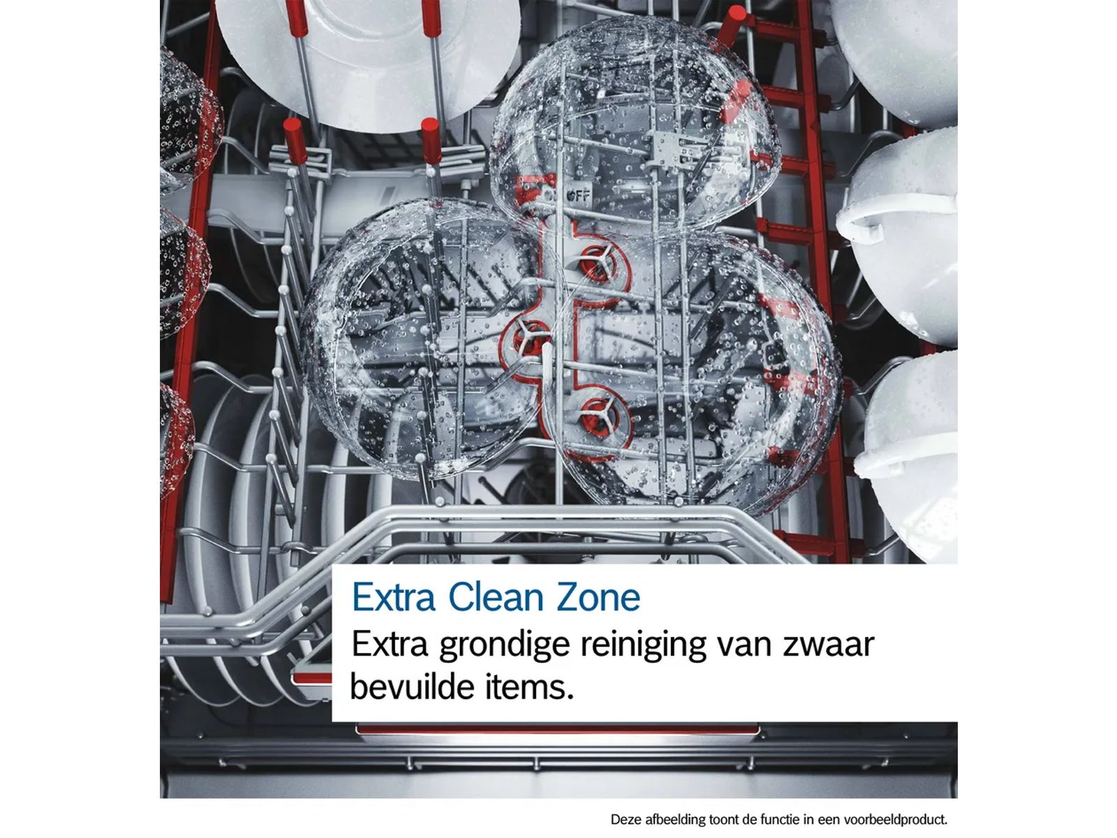 Opgedroogde etensresten zijn bij niemand geliefd: gelukkig maakt de Extra Clean Zone de vaat in de bovenkorf grondig schoon. Drie roterende watersproeiers zorgen voor extra schoonmaakkracht. En dat allemaal zonder extra detergent of een hogere temperatuur. Met één druk op de knop zorgt je vaatwasser voor een perfect resultaat.